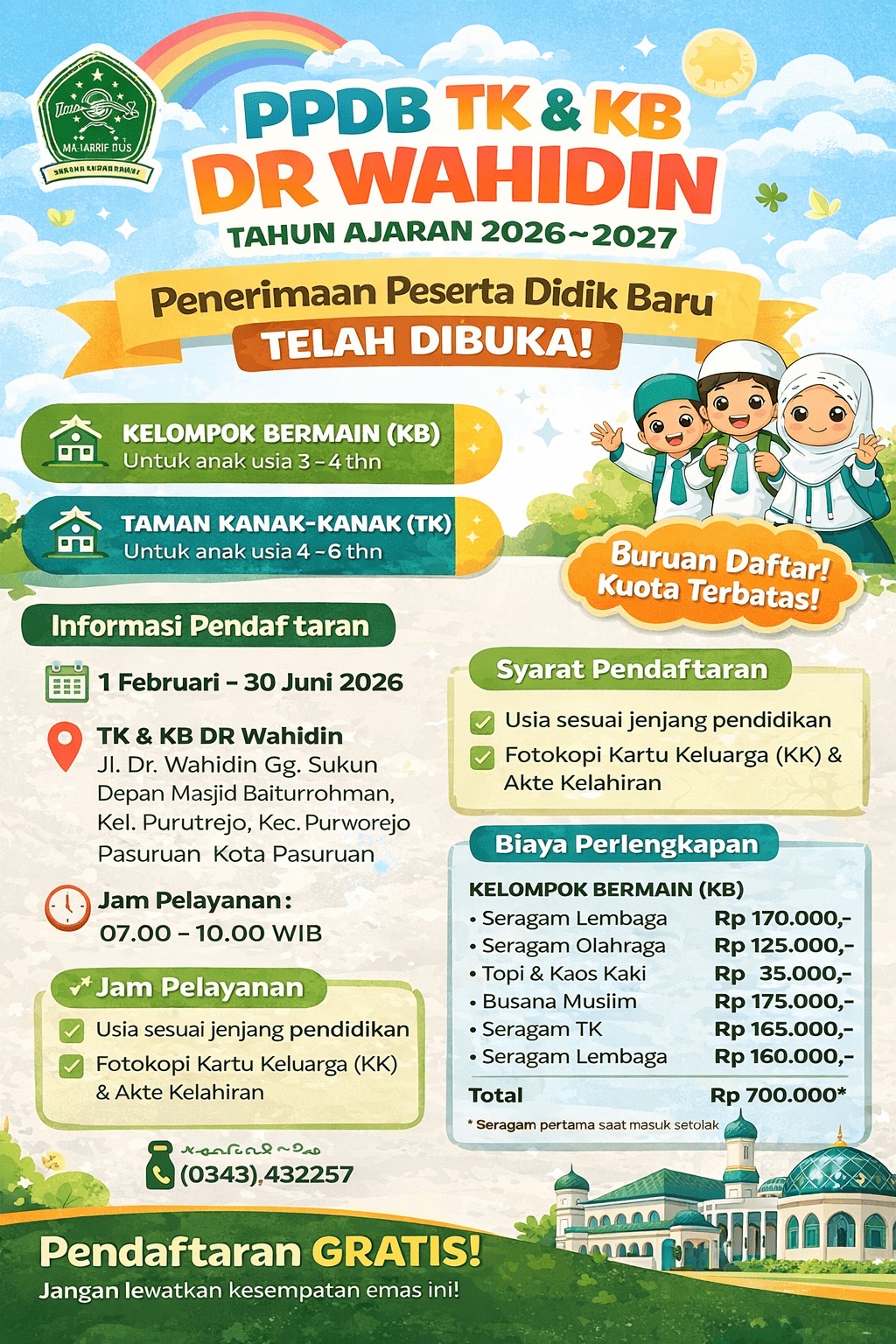 PPDB TK & KB DR Wahidin Tahun Ajaran 2026–2027🎓 Penerimaan Peserta Didik Baru Telah Dibuka!TK dan Kelompok Bermain DR Wahidin Pasuruan membuka kesempatan bagi putra-putri terbaik untuk bergabung...